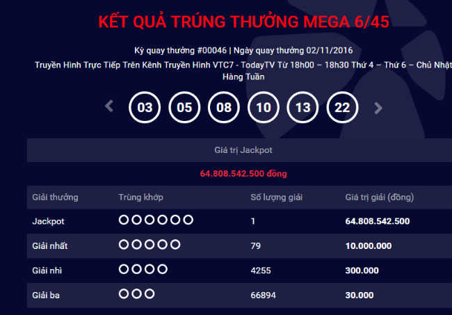 Tại kỳ quay thứ 46 của xổ số Mega 6/45 ngày 2/11, Công ty xổ số điện toán Việt Nam (Vietlott) đã xác định được tấm vé số giải độc đắc thứ hai ở Việt Nam với trị giá giải thưởng gần 65 tỷ đồng.