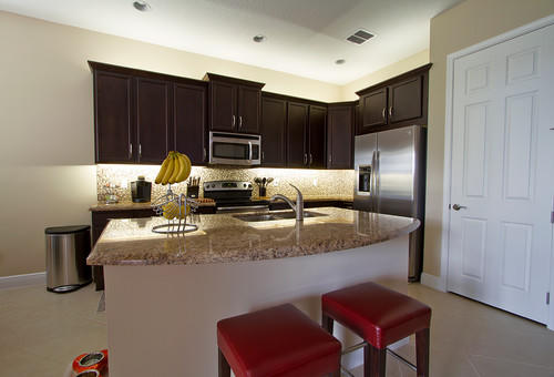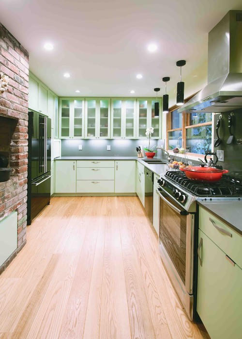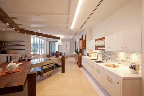 Ở đây, đèn âm tường, đèn treo dưới tủ và bên trong tủ gỗ kết hợp để tạo ra một nhà bếp đầy ánh sáng với việc sử dụng sự linh hoạt, tùy vào mục đích và tiết kiệm điện.