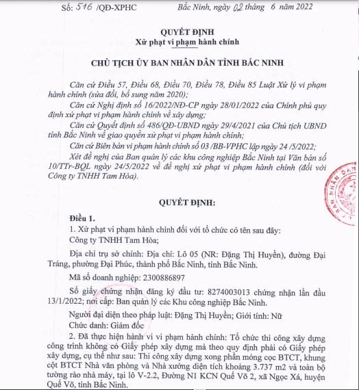 Tại Quyết định số 516/QĐ-XPHC ngày 2/6/2022, Công ty TNHH Tam Hòa, địa chỉ tại phường Đại Phúc, TP Bắc Ninh đã xây dựng phần móng cọc BTCT, khung cột BTCT Nhà văn phòng, nhà xưởng diện tích khoảng 3.737 mét vuông và toàn bộ tường rào nhà máy, tại lô V-2.2, Đường N1 KCN Quế Võ 2, xã Ngọc Xá, huyện Quế Võ, tỉnh Bắc Ninh.