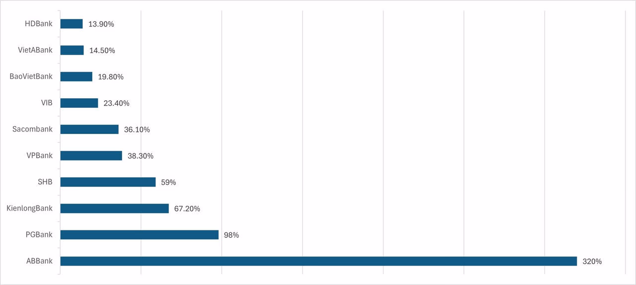 Xét về mức tăng trưởng lợi nhuận trong quý II/2025, ABBank dẫn đầu hệ thống với mức tăng trưởng 320% so với cùng kỳ, lên 1.253 tỷ đồng. Kéo theo đó, tăng trưởng lợi nhuận trước thuế 6 tháng đầu năm của ABBank đạt 1.669 tỷ đồng, tăng gần 200% so với cùng kỳ và hoàn thành 93% kế hoạch đề ra.