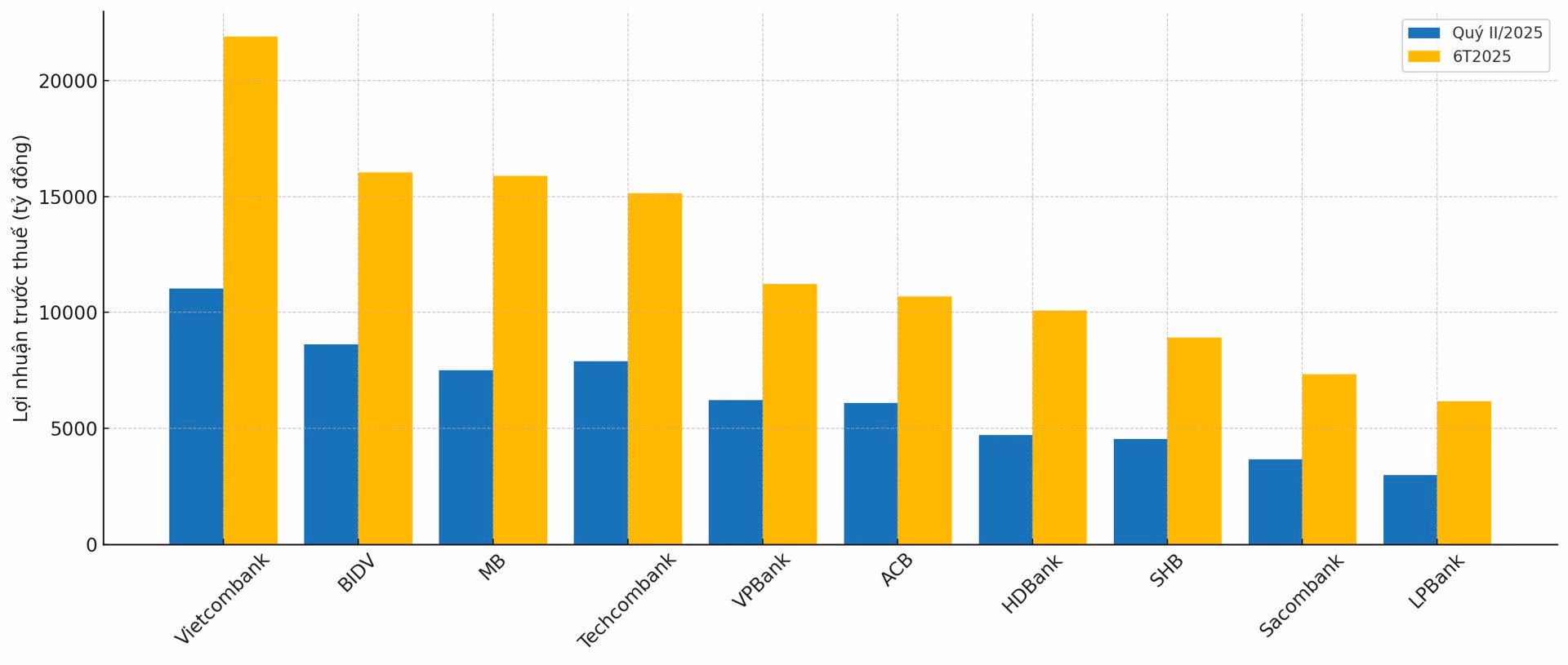 BIDV xếp thứ hai với 8.625 tỷ đồng lợi nhuận quý II (tăng 5,7% so với cùng kỳ) và 16.038 tỷ đồng sau 6 tháng (tăng 3,1%).Techcombank đứng thứ ba với lợi nhuận quý II đạt 7.899 tỷ đồng, tăng 0,9% so với cùng kỳ. Song, tổng lợi nhuận trước thuế 6 tháng đầu năm 2025 của ngân hàng này đạt 15.135 tỷ đồng, giảm 3,2% so với cùng kỳ năm ngoái. Do đó, Techcombank bị MB vượt qua về lợi nhuận trước thuế 6 tháng đầu năm 2025. MB đạt 15.889 tỷ đồng lũy kế 6 tháng đầu năm 2025, tăng trưởng mạnh 18,3% so với cùng kỳ.