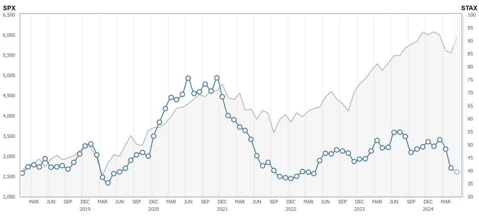 Lực cầu từ nhà đầu tư cá nhân tại Mỹ cũng đang suy yếu rõ rệt. Ông Nguyễn Thế Minh dẫn dữ liệu từ Schwab cho hay, chỉ số STAX – đo lường hoạt động giao dịch của nhóm nhà đầu tư cá nhân – tiếp tục lao dốc, phản ánh xu hướng bán ra đang chiếm ưu thế và tâm lý bi quan ngày càng tăng.