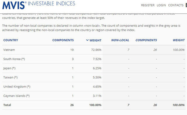 MVIS Vietnam Index là một trong các bộ chỉ số cơ sở của MVIS Indices để cho các quỹ đầu tư mô phỏng theo khi đầu tư vào Việt Nam. Chỉ số dự trên giá trị vốn hóa này theo dõi hoạt động của các doanh nghiệp lớn và tính thanh khoản cao nhất Việt Nam. Đây đều là các công ty địa phương hoặc các doanh nghiệp nước ngoài tạo ra ít nhất 50% doanh thu của họ ở Việt Nam.