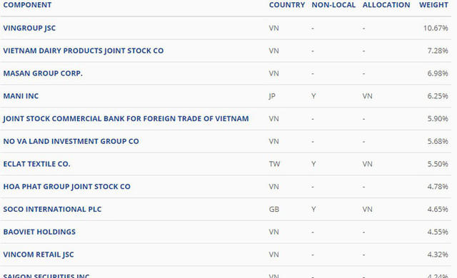 Sau đợt cơ cấu này, danh mục cổ phiếu Việt chỉ còn 17 với Vingroup (VIC) đứng đầu với tỷ trọng 10,67%, Vinamilk (VNM) với 7,28%; Masan (MSN) với 6,98%, Vietcombank (VCB) 5,9%, Novaland (NVL) 5,68%, Hòa Phát (HPG) 4,78%...