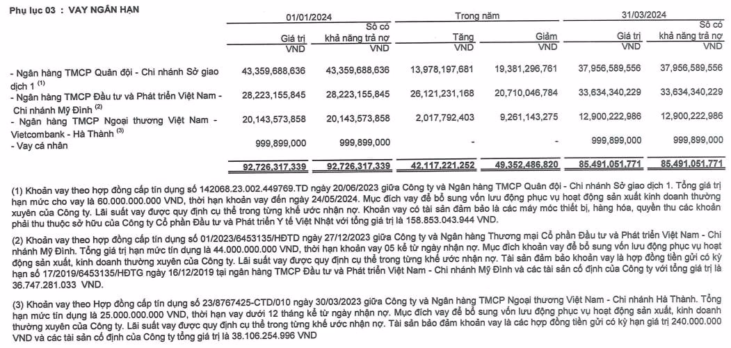 Vay và nợ thuê tài chính của Y tế Việt Nhật trong quý I/2024 ở mức 85,4 tỷ đồng, chiếm 47% nợ phải trả của doanh nghiệp.